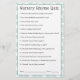 Uma ideia fofa como um jogo de chá de fraldas, esta pergunta e resposta apresenta perguntas muito amadas de rima de berçário. Cada convidado recebe uma folha de jogo e preenche suas respostas. Depois que todos completarem suas respostas, o chamador do host ou do jogo faz as perguntas e fornece as respostas corretas. O convidado com as respostas mais corretas ganha um prêmio! Esta design tem um adorável urso panda na parte de trás do cartão de jogo e usa o tema coordenador do aqua e do bege de marfim para combinar uma coleção de produtos chás de fraldas nesse tema bonito e neutro em termos de gênero. Eis as respostas às perguntas sobre o cartão de jogo: 1. Torta de Natal. 2. quatro e vinte. 3. Um pimento de pimentos picados. 4. açougueiro, padeiro, criador de velas. 5. cheio de graça. 6. um pônei. 7. para buscar uma pilha de água. 8. beijou-os. 9. A esposa do agricultor. 10. um osso. 11, o jantar. 12. Um pieman. 13. sinos prateados, rodas de cockle, empregadas bonito, todas seguidas. 14. Um porco