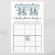 Jovens gêmeos bonitos jogando bingo chá apresentando "chá de fraldas bingo" em um roteiro de cinza com baloiços e uma cor azul pastel de elefantes gêmeos bebês.