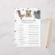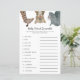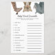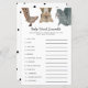 Cartão de jogo de desembaralhar palavras de bebê com tema de safari fofo com ilustração de animais (rinoceronte, girafa, leopardo). A lista de palavras neste cartão são todas relacionadas a bebês e elas estão embaralhadas. Os convidados vão competir para ver quem consegue desembaralhar todas elas primeiro! CHAVE DE RESPOSTA: 1. assento de carro 2. leite 3. parque 4. chupeta 5. fralda 6. cadeira de balanço 7. berçário 8. babá eletrônica 9. embrulhar 10. fórmula 11. patinho de borracha 12. carrinho de bebê.