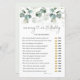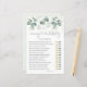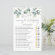 Este design apresenta um Jogo do Chá de fraldas "Adivinha quem - Mamãe ou Pai" no estilo Watercolor com folhas de eucalipto. Na parte superior da placa - esverdeado e confete de efeito do ouro. O texto "mamãe ou pai" é escrito em caracteres de script com coração unido.
