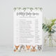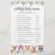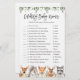 Cartões de jogos para celebridades do chá de fraldas com tema de celebridades do bosque apresentam uma ilustração de animais da floresta com cor d'água e verde-d'água eucalyptus garland e uma elegante letra de estilo manuscrito.