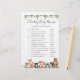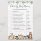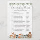 Cartões de jogos para celebridades do chá de fraldas com tema de celebridades do bosque apresentam uma ilustração de animais da floresta com cor d'água e verde-d'água eucalyptus garland e uma elegante letra de estilo manuscrito.