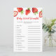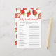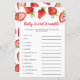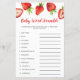 Chá de fraldas de morango bonito, placa de quebra-cabeça de bebê apresentando a ilustração aquosa da fruta de morango. A lista de palavras neste cartão está relacionada com bebês e eles estão embaralhados. Os hóspedes vão competir quem pode desembaraçar todos eles primeiro! CHAVE DE RESPOSTA: 1. cadeirinho 2. leite 3. caneta de recreio 4. pacificador 5. fralda 6. cadeira de balanço 7. berçário 8. baby monitor 9. pastilha 10. fórmula 11. rolete de borracha 12.