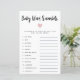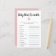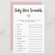 Um cartão moderno e simples de palavras de bebê de chá de fraldas menina apresentando um coração cor-de-rosa. A lista de palavras neste cartão está relacionada com bebês e eles estão embaralhados. Os hóspedes vão competir quem pode desembaraçar todos eles primeiro! CHAVE DE RESPOSTA: 1. cadeirinho 2. leite 3. caneta de recreio 4. pacificador 5. fralda 6. cadeira de balanço 7. berçário 8. baby monitor 9. pastilha 10. fórmula 11. rolete de borracha 12.