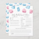 Cartão de jogo de festa de revelação de gênero fofo com ilustração de macarons em forma de coração rosa e azul. Jogo perfeito para jogar durante o chá e será definitivamente uma ótima lembrança! O cartão aos convidados que prevejam qual será o sexo do bebê e como ele será.