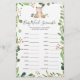 O cartão de jogo de palavras-chá de fraldas com tema Bear apresenta uma ilustração de urso-aquarela e verde-aquarela eucalyptus garland e uma elegante fonte de estilo manuscrito.