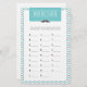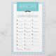 O jogo Baby ABCs é uma atividade divertida para qualquer Chá de fraldas, à medida que os convidados tentam preencher as cartas com itens bebês que começam com cada letra do alfabeto. Num esquema de cores para cinzas e turquesas, este cartão apresenta uma ilustração do bigode. A adição perfeita a um Chá de fraldas temático "Homem Pequeno"! Encontre outros jogos e itens correspondentes em www.zazzle.com/mypartydesign