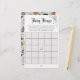 Este jogo de Chá de fraldas do Dia das Bruxas chama-se "Bingo do Bebê". A design: Na frente, uma placa de jogo BINGO com instruções. No verso, um padrão desenhado à mão em tinta preta com carruagems vitorianas para bebês, corvos pretos, teias aranha, abóboras e pequenos cogumelos, todos sobre um fundo de cinza suave elegante. Como jogar: Cada convidado recebe um cartão Bingo. Antes de a Mãe-Ser abrir seus presentes, cada convidado enche os quadrados com presentes que ele pensa que a Mãe-a-Ser receberá. Enquanto ela desembrulha cada presente, os hóspedes cruzam o item do presente no cartão. O primeiro convidado a receber 5 em fila ganha.