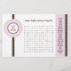 Esses jogos de 5,5" x 8,5" podem ser personalizados com o nome de seu convidado de honra no topo. Use-os como um quebra-gelo divertido para os hóspedes, fazendo-os correr para encontrar as palavras do bebê escondidas. Este design coordena-se com outros itens, como convites, notas agradecidas, adesivos e muito mais!