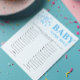 Prepare-se para divertir-se com o nosso Jogo de Chá de fraldas de Raça de Bebê Azul "Pequena Querida", uma atividade encantadora para a sua celebração! Neste jogo, os convidados correrão contra o relógio para inventar tantos nomes de bebês por alfabeto no tempo alocado. Aquele com mais nomes ganha um doce prêmio! Feito com sotaques azuis encantadores e detalhes adoráveis do coração, este jogo adiciona um toque de doçura às suas festividades de chá de fraldas. É perfeito para manter convidados entretidos e noivos enquanto celebra a chegada do seu pequeno. Quer você esteja hospedando uma pequena reunião ou uma grande festa, todos vão gostar de participar desse jogo divertido e excitante. Com o nosso Jogo de Chá de fraldas Raça de Bebê "Pequena Querida" Azul, você pode adicionar um toque de diversão e riso à sua celebração enquanto cria memórias duradouras com seus entes queridos. Que a corrida comece!