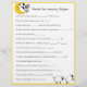 Um jogo divertido para jogar num Chá de fraldas. Todos se lembram de rimas de berçários e isso terá seus convidados zunindo ao mesmo tempo tentando descobrir as palavras que faltam. Respostas: 1. velo 2. lã 3. ao contrário 4. eles chegaram lá 5. padeiro 6. Natal 7. coalhada e soro de leite 8. pimentões picados 9. bater 10. manter 11. armário 12. calçado 13. magra 14. gato 15. tripa