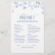 Apresentando nosso brilhante jogo de Chá de panela vitoriano francês azul e branco! Este jogo "o que está no seu telefone" é a adição perfeita ao seu próximo chá de panela. Ele apresenta uma mistura refrescante de estilo tradicional e moderno, com flores azuis vitorianas clássicas desenhadas à mão de flores de jardim, abelhas e borboletas de um lado. Além disso, você pode personalizá-lo com seus próprios detalhes noivas na caligrafia moderna escrita à mão para torná-lo realmente único. E como um toque especial adicionado, vire-o para encontrar uma textura azul coordenadora no verso adicionando ainda mais detalhes. Não hesite - este jogo de uma só vez fará com que o seu evento se lembre de todos! Ver suite aqui: https://www.zazzle.com/collections/french_blue_white_victorian_floral_bridal_shower-119265327422133417 Contacte o designer para produtos correspondentes. Copyright Surridge Design Co. para Elegant Invites, todos os direitos reservados.