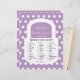 Pegue suas bolsas e o vamos jogue o chá de panela da bolsa! Essa torção fofa ao jogo tradicional coloca um dentro de bolsa no design com todos os detalhes do jogo dentro na bolsa. A bolsa branca apresenta as palavras "O que tem na bolsa?" Chás de panela respondem à pergunta o que está em sua bolsa colocando uma marca de seleção pelos itens que eles realmente têm na bolsa. A bolsa fica sobre um fundo lilás ou roxo que faz um belo pano de fundo para este jogo de bolsa. Além disso, você pode personalizar o design com o nome da noiva e a data do chá. Um jogo de chá de panela de bolsa de excelente para o seu chá de panela. Direitos autorais