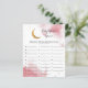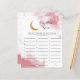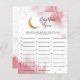 Um cartão de jogo "baby name", com chá de fraldas sobre o tema da lua, com uma abertura de cor-de-água a rosa, com lua de ouro falsa e estrelas. Os textos são editáveis. Um jogo perfeito para jogar durante o chá. aos hóspedes para anotar nomes de bebês que começam com cada alfabeto. Quem termina todos os alfabetos primeiro ganha!