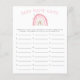 Tema do arco-íris bonito Cartão de chá de fraldas com nome de bebê apresentando ilustração do arco-íris cor-de-rosa pastel com estrelas. Os textos são editáveis. Um jogo perfeito para jogar durante o chá. aos hóspedes para anotar nomes de bebês que começam com cada alfabeto. Quem termina todos os alfabetos primeiro ganha!