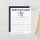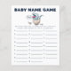 Cartão "baby name game" do tema do dinossauro azul, branco, com ilustração de uma eclosão t-rex azul a partir de um ovo. Os textos são editáveis. Um jogo perfeito para jogar durante o chá. aos hóspedes para anotar nomes de bebês que começam com cada alfabeto. Quem termina todos os alfabetos primeiro ganha!
