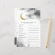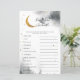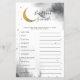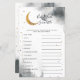 Carta de palavras de bebê em forma de chá de fraldas sobre o tema da lua, com abertura de cinzas de cor d'água com lua de ouro falsa e estrelas. A lista de palavras neste cartão está relacionada com bebês e eles estão embaralhados. Os hóspedes vão competir quem pode desembaraçar todos eles primeiro! CHAVE DE RESPOSTA: 1. cadeirinho 2. leite 3. caneta de recreio 4. pacificador 5. fralda 6. cadeira de balanço 7. berçário 8. baby monitor 9. pastilha 10. fórmula 11. rolete de borracha 12.