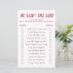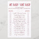 Teste o quão bem os convidados conhecem o casal com este divertido jogo "Ele Disse Ela Disse" para Chá de Noiva. Os convidados leem cada afirmação e adivinham se foi a noiva ou o noivo quem disse. É uma atividade simples e divertida que faz todos rirem e se envolverem. Perfeito para chás de noiva, despedidas de solteira ou celebrações de casamento. Personalize o design para combinar com o tema do seu evento e crie um momento memorável para a noiva e os convidados.