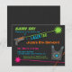 Planeje uma festa de aniversário cheia de diversão com jogos de laser! Crianças e adolescentes vão ter um dia cheio de adrenalina testando sua agilidade, mira e habilidades de trabalho em equipe. Este convite tem luzes laser coloridas de néon disparando através da arma de brinquedos decorados com laser e equipamentos. Adequado para crianças e adolescentes, especialmente para aniversários! Personalize facilmente com os detalhes do seu partido.