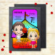 Convite de festas colorido, bonito, com duas crianças com circo ou tenda de festa no fundo do quadro. Excelente para uma festa com jogos e atividades.
