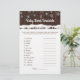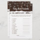 Jogos de chá de fraldas com palavras de bebê raspando de um lado, e teste de rima de berçário do outro. Este floco de neve rústico com folheto de jogos de chá de fraldas fofo é facilmente personalizado para o seu evento. Você pode mudar as perguntas e as palavras. Entregue-os aos seus hóspedes dizendo-lhes para não olharem, e depois comece o relógio. Quando o tempo acabar, leia as respostas e a pessoa com mais direito ganha um prêmio. Você pode até adicionar as palavras e rimas de sua escolha! Aqui estão as respostas aos jogos: Respostas do Word Scramble: 1. Bassinet 2 Fralda 3. Frasco 4. 5. Banco do carro 6. Mobil 7. Shampoo 8. Toalha 9. Bebê Limpa 10. Pacificador 11. Rolador 12. Respostas Do Enfermeiro Rhyme: 1. Três 2. Foi Embora 3. No início da manhã 4. Ri, Spoon 5. Vidro 6. Verde e amarelo