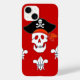 A bandeira pirata do Jolly Roger branco vermelho com três pulgas de lise.