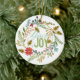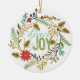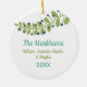 Bonito ornamento cerâmico de Natal com fundo branco, ramos, folhas, galhos verdes, bagas e flores design com aqua e texto verde que lê Peace & Joy, uma área atrás para personalizar com seu nome familiar, nomes próprios e ano atual!