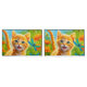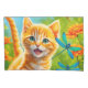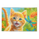 Um gatinho de mesa de laranja giro que franja num jardim floral com libélulas coloridas.