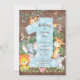 Boias da Selva Bestial Convite de Aniversário com um grande número azul rodeado por animais safari, macaco, girafa, leão, elefante e zebra num fundo de madeira marrom rústica.