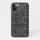Um padrão intrincado de cruzes e círculos de cinzas que se entrelaçam sobre um fundo preto com apenas uma dica de cor.