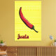 Uma pimenta vermelha de jwala chili, também conhecida como pimenta de um dedo quente indiano, é decorada com padrões inspirados pela médi indiana e se senta sobre um fundo amarelo com uma versão menor do mesmo padrão e uma etiqueta de roteiro no canto. Este pimenta moderadamente picante é utilizado para adicionar calor a curries autênticos e a outra cozinha indiana.