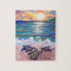 Divirta-se com a sua família juntando esta quebra-cabeça de três tartarugas marinhas bebê rastejando em direção ao oceano no pôr do sol.