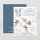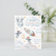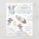 Um espaço e astronauta temem o Convite de aniversário infantil. Num fundo branco, cinco animais vestidos de astronautas incluindo um urso, raposa, coruja, cão e coelho são vistos pegando estrelas amarelas e cavalgando em um foguete. A Festa de aniversário do nome da sua criança está escrita em uma nuvem, sua idade em texto decorativo amarelo, e os detalhes do evento em um planeta rosa. Personalize adicionando seu evento de cheio e os detalhes de contato à frente e atrás.
