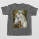 A white unicorn covers the front of this kid's t-shirt.