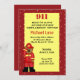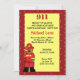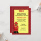 Soe o alarme para este bombeiro que está dando uma saudação. Urso em equipamento de bombeiro com um convite quente a uma festa de aniversário. Personalize com os detalhes do seu partido.