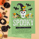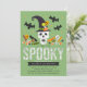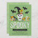 Prepare-se para uma celebração terrivelmente divertida com este convite de festas de fantasia de Halloween fofo! Apresentando um chapéu branco de bruxa, crânio, morcegos e doces sobre um fundo verde brilhante, esta design é perfeita para um baixo assustador para crianças. Divertido, brincalhão e atraente, ele define o tom perfeito para os truques ou tratamentos e partidários de todas as idades. Personalize com os detalhes do seu partido e deixe que a assombração comece!
