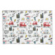 A playful, cartoon-style city pattern featuring buses, cars, helicopters, traffic lights, buildings, and fun doodle text like “Beep Beep,” “Wuz Up?” and “Go,” in bright red, yellow, blue, and black tones.