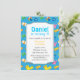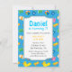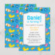 Planejar crianças que têm aniversários no verão? Um tema colorido da piscina é perfeito para acalmar o calor e divertir-se. Faça um salto com convidados com este legal convite de aniversário azul que tem elementos fofos de piscina organizados em um padrão. Inclui itens como tronco verde, balde azul com ícone de peixe, flutuador, flutuador de pato, uma arma de água de brinquedo, uma fantasia de natação rosa, uma máscara de ronco e uma bola grande. Perfeito para quem tem piscina no quintal ou piscina inflável ou que tem o evento em um parque temático aquático. Personalize facilmente com os detalhes do seu partido.