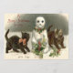 Hora de ir para casa da igreja. Este impressão de natal vintage mostra crianças caminhando em um lago congelado, carregando uma árvore de Natal e presentes. Uma igreja e lua de cheio no fundo.