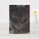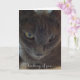 Um cartão de saudação com um gato cinza bonito que diz "Pensando em você e esperando que você se recupere logo."