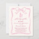 A soft ivory colored background, decorated with a hand drawn pink bow. Personalize and add a name and party details.