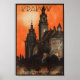 Uma velha poster de viagens vintage para a Polônia de Cracóvia. Belo design de pintura a óleo. Uma velha igreja gótica com torre de relógio. Muitas amostras podem ser vistas ao fundo. Um pôr do sol vermelho alaranjado impressionante cria um humor escuro e misterioso.