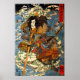 Poster de Kuniyoshi Samurai. Bloco de madeira Ukiyo-e do Edo Período Japão. Utagawa Kuniyoshi desenhou algumas das mais vibrantes e impressionantes pinturas samurai do período Edo. Sua representação de Shimamura Danjo Takanori mostra o samurai em armadura de cheio ou carregando sua naginata enquanto cavalgava as ondas do mar nas costas de dois caranguejos azuis. O samurai foi atingido por múltiplas setas, mas luta ferozmente com ondas e ascensões de caranguejo no fundo. Um presente de excelente para fãs de Utagawa Kuniyoshi, pinturas de samurai e arte japonesa.