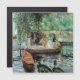 Pierre-Auguste Renoir. La Grenouillère.. uma bela paisagem no rio em tons verdes. Há barcos na costa. No meio do chão, um grupo de pessoas se posiciona em uma passagem por baixo de uma árvore de espalhamento. Ao fundo há yazta e árvores. Reprodução de famosas imagens de arte no dominio público.