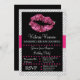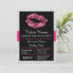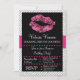 Lábios brilhantes Beijando Adultos O Convite de Aniversário apresenta um par de lábios brilhantes cor-de-rosa-quente e é perfeito para um aniversário milestone quando se dá um beijo de adeus nos anos. Este convite de aniversário também apresenta um fundo listrado de brilho prateado. A ideia de anúncio de celebração.