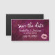 Magnético, salve a data com lábios de falso-brilho cor-de-rosa. O fundo é um padrão cor-de-rosa avermelhado escuro com folhas tropicais de palma.