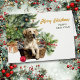 Neste cartão de Férias, um cão Labrador Retriever amarelo deita-se na sua cama de vime em frente a uma árvore de Natal decorada. Também atrás da cesta há um bonito buquê vermelho de morango e pinho. O texto dourado à direita diz "MERRY CHRISTMAS", com FELIZ ANO NOVO em verde abaixo. Todo o texto, dentro e fora, pode ser facilmente mudado para qualquer coisa que você quiser. Vocês podem ver mais imagens do Labrador Retriever, assim como outras imagens de raças, na Aldeia dos Cachorros.