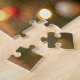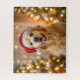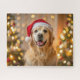 Um recuperador de ouros que veste um chapéu vermelho de Papai Noel. A sala com bokeh das luzes de Natal piscando no fundo.