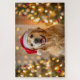 Um recuperador de ouros que veste um chapéu vermelho de Papai Noel. A sala com bokeh das luzes de Natal piscando no fundo.