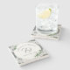 White Lace and Rosa Leaves design apresenta nomes de casais em texto elegante prateado exibido como um arco contra um suporte branco. O plano de fundo apresenta a imagem de um local branco. O centro exibe o sobrenome inicial. A data de casamento é exibida abaixo. As folhas verdes de rosa são delicadamente posicionadas nas bordas. Projetado para coordenar com o "White Lace and Rosa Leaves Wedding Suite".